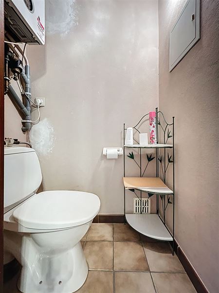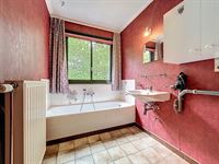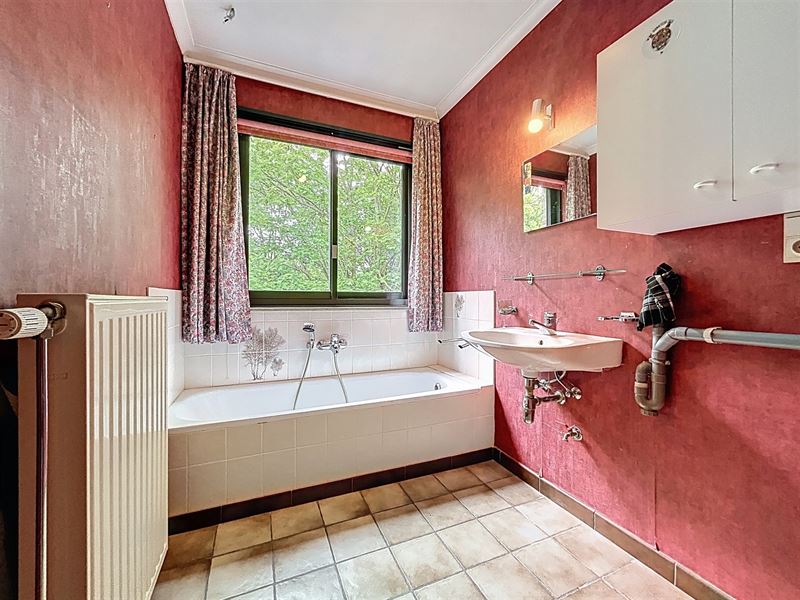Badkamer met bad, lavabo en aansluiting wasmachine. Apart toilet.