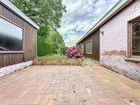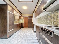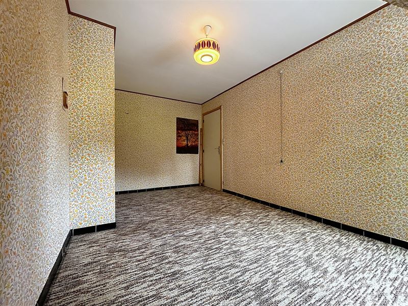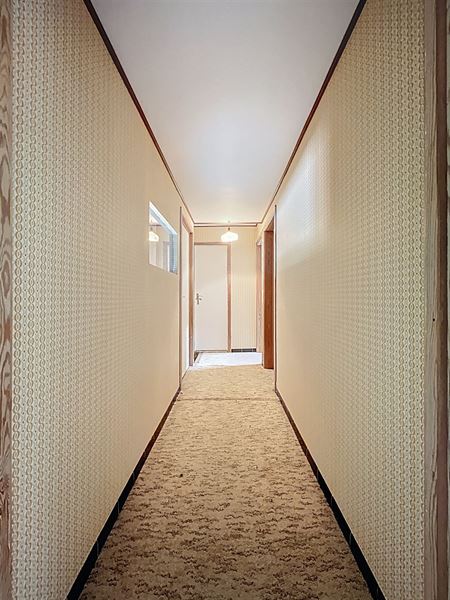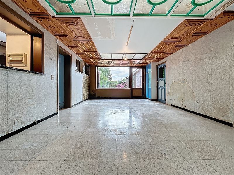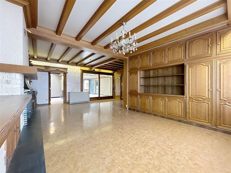 Bij binnenkomst via de inkomhal bereik je de leefruimte en een garage die momenteel dienst kan doen als berging, bureau of fietsenstalling. De lichtrijke leefruimte sluit aan op een veranda met zicht op de diepe tuin. De aparte keuken biedt mogelijkheden tot modernisering en open indeling.