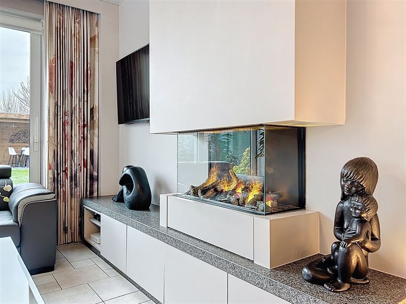 Lichtrijke leefruimte met moderne sfeerhaard, aparte keuken met alle benodigdheden.