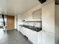 Leefruimte met open keuken en toegang tot ruim terras, één slaapkamer met ingebouwde kasten en aparte badkamer met douche en toilet.