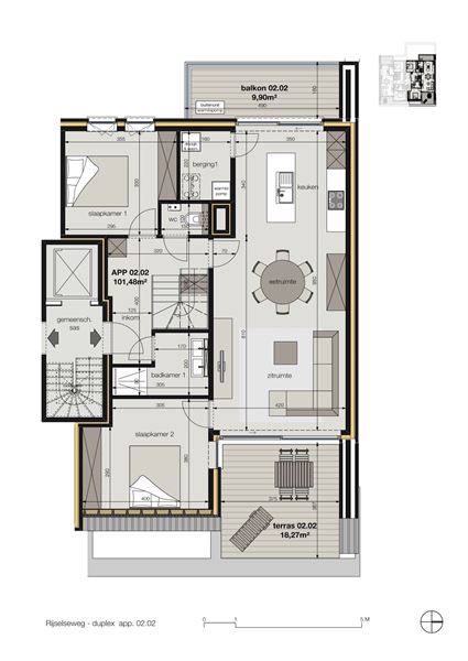 Het appartement heeft een bewoonbare oppervlakte van 159,1m² en wordt voorzien van inkom, 2 slaapkamers, ingerichte badkamer, apart toilet, berging, open keuken met lichtrijke leefruimte en toegang tot terras voor(18,27m²)- en achteraan (9,90m²).