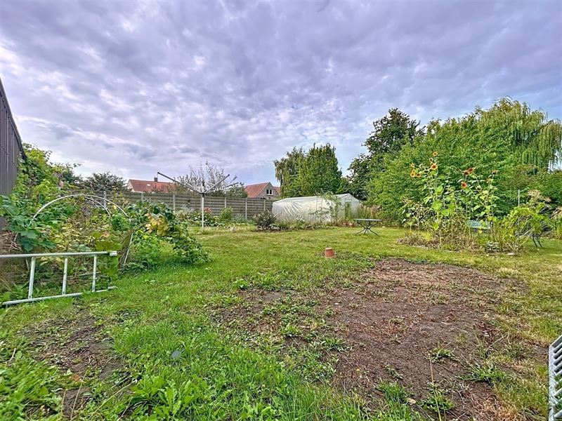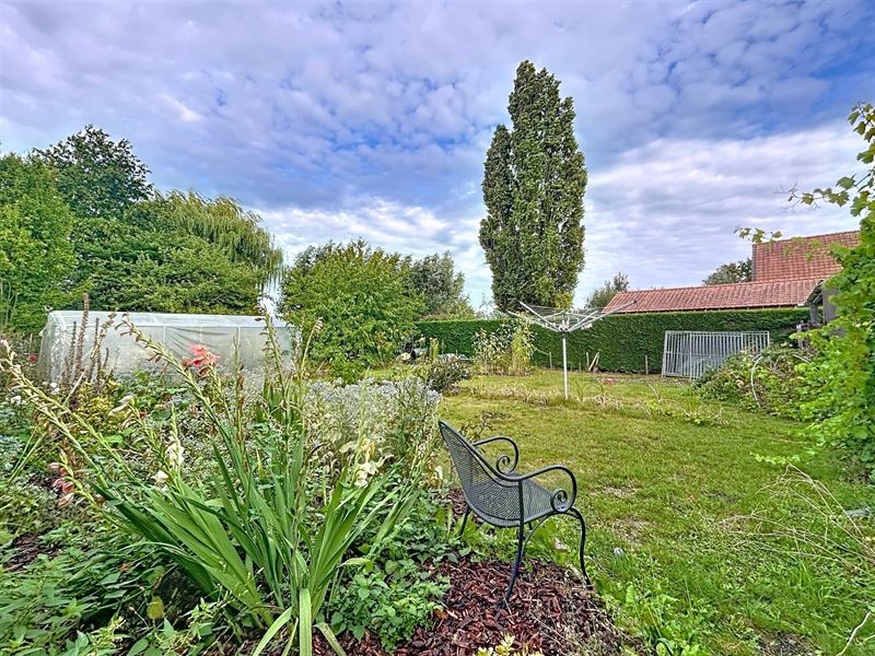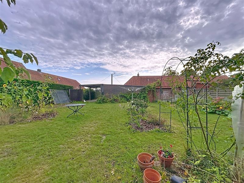 Aan de achterzijde van de woning is een koer, koterijen, een diepe garage, een carport en een ruime, groene tuin.